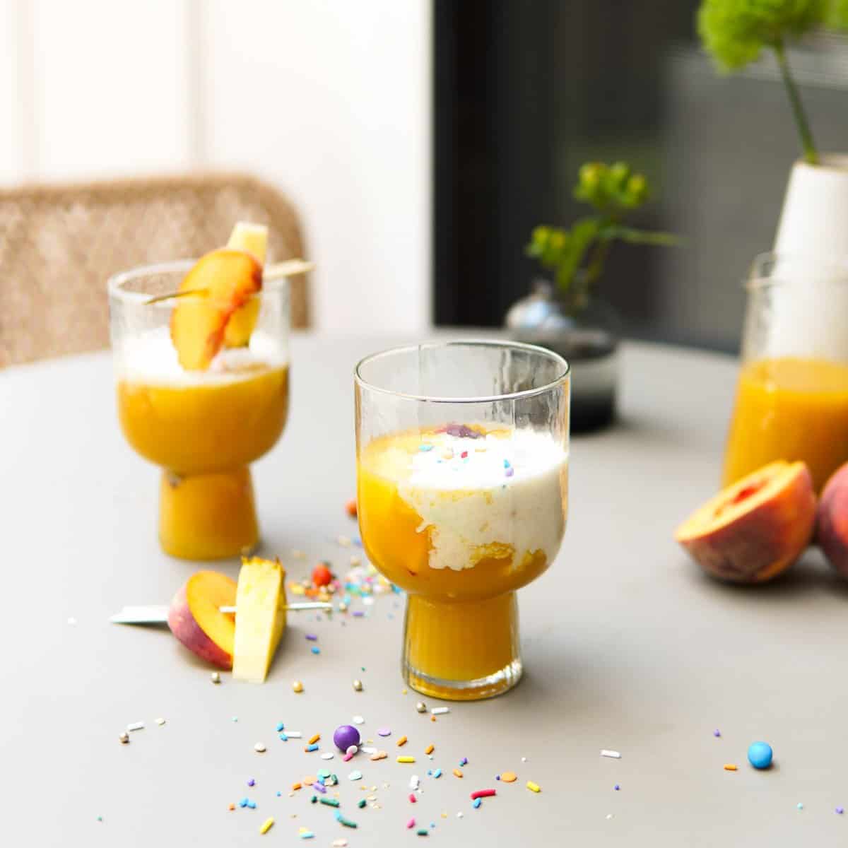 This heavenly and super easy punch cocktail recipe reminiscent of a Creamsicle is actually a German punch called Schlammbowle. It combines bite-sized fruit pieces and juices with vodka, sparkling wine, and vanilla ice cream. Top everything off with some sprinkles for a bit of extra fun.